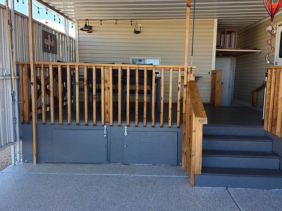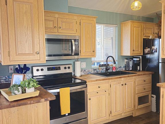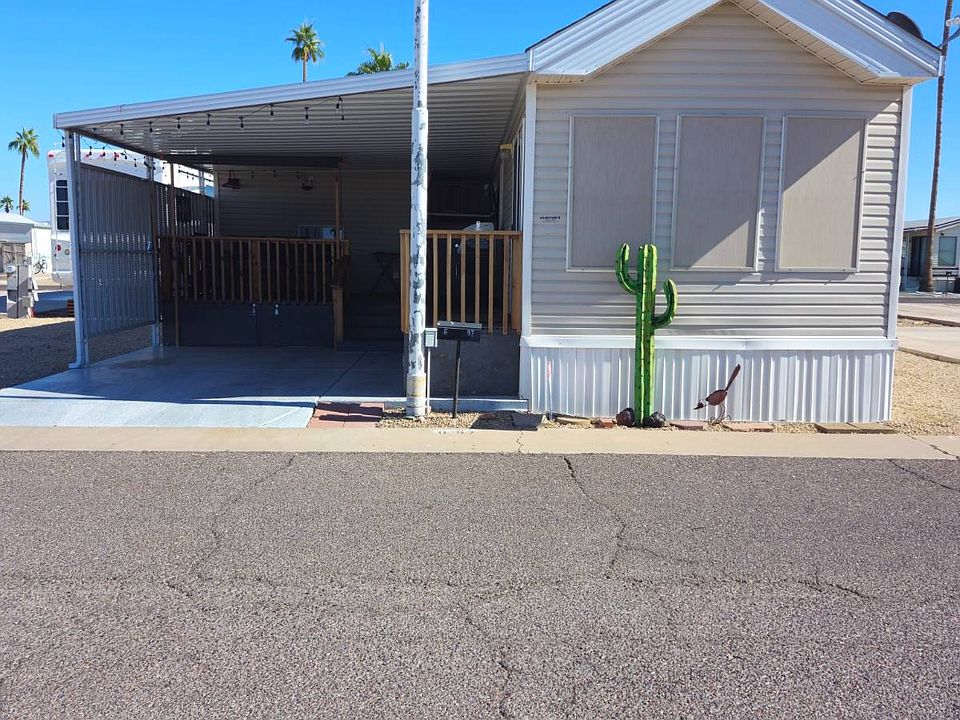 This turnkey, meticulously cared-for 1 bed / 1 bath home is bursting with charm. Step inside to a bright, airy living room featuring vaulted ceilings & beautiful wood flooring throughout. The kitchen is a delight, showcasing light natural wood cabinets, a butcher block counter top with a farmhouse sink, and ample cabinets. The spacious bedroom offers plenty of closet space to keep everything organized, while the upgraded bathroom adds a touch of modern comfort. You've got a large covered deck that's perfect for morning coffee or entertaining w/ family & friends. Newer Sunscreens to keep the home cooler. A large storage shed w/ washer and dryer is included for added convenience. Brand-new HVAC system & roof less than 2 years old, as well as new light fixtures throughout. And get this - it comes fully furnished w/ stylish, gently used furniture. Just bring your toothbrush & suitcase & move right in! Don't sleep on this one - homes this fresh don't last! There is a dishwasher in the shed but the owners never used it. Located in the welcoming 55+ Mesa Spirit community (park approval required). BBQ grill does not convey with home!