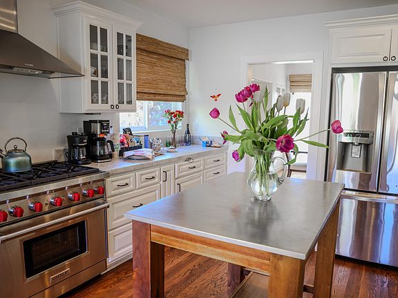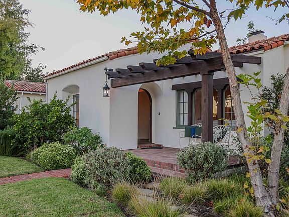 This timeless 3 bed / 2 bath Spanish-style, single-story residence charms with two wings and a great room large enough for 40 guests on a lush green .21-acre lot. Classic 1930 architecture blends beautifully with thoughtful updates—arched doorways, wood-beamed, ceilings, barn and French doors, central heating and air conditioning, and a welcoming energy felt the moment you step inside. The chef's kitchen is extraordinary in its charm and convenience: it features a gas range, granite countertops, ample cabinetry, breakfast bar, and instant hot water; it opens into a cozy family room with windows framing mountain views and the vibrant backyard where the approved and current plans included for 1000 sq ft ADU can be realized. The spacious great room combines living room and dining, anchored by a wood-burning fireplace.