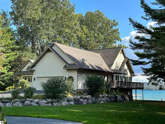 TORCH LAKE PRIVATE 106’ FRONTAGE! – Fabulous custom 5500+ sq ft 4BR, 4.5BA home, 2 fireplaces, quality throughout, finished lower-level walkout, desirable Torch Lake Point Shores, wall of lakeside doors/windows, high-end kitchen, vaulted ceilings 4-season waterside sunroom, expansive deck for entertaining, 2 acres offers great opportunities for expansion, private cul-de-sac location between Elk Rapids and Charlevoix.