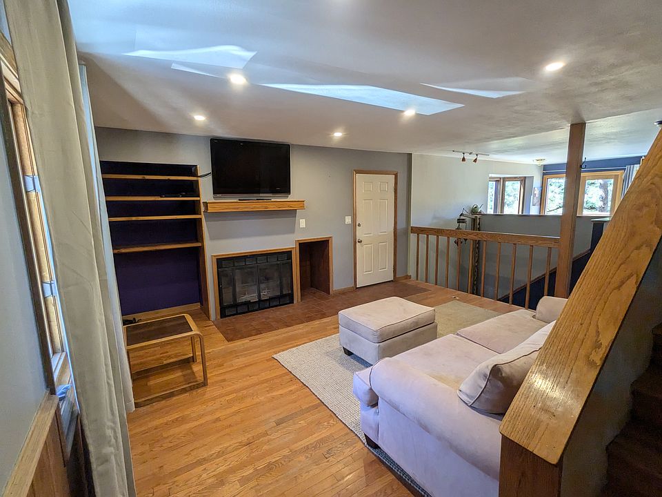 On the top floor are 2 big bedrooms and a spacious updated full bathroom with a large bathtub. The master bedroom has 2 huge closets, built-in shelves and a built-in nook that could be used for A Vanity or Small Office Space. A large private walk-out balcony that faces southeast for morning light - perfect for your morning cup of coffee is Just off of the Main Bedroom. The second bedroom features a full wall of built-in drawers, full-size closet, and a beautiful view of pine trees. Great for a home office or home gym.