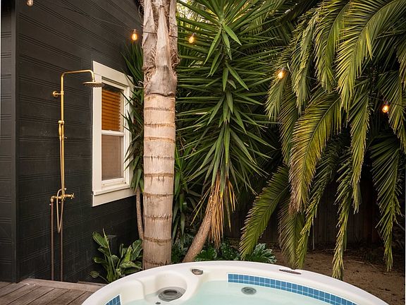 Secluded lush backyard spacePalm treesLush front gardenDining roomOutdoor shower and spaHot tubFast wi-fi