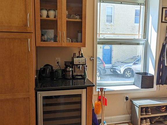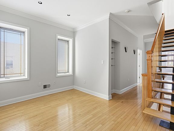 Upstairs, the second floor offers a well-lit front bedroom next to a full bathroom with a soaking tub and jets. A bonus roomcurrently used as an officeleads to the remodeled primary bedroom, which includes two large closets, a spa-style shower, and double vanity. The third floor features a party room with a wet bar and mini-fridge hookup, opening to a rooftop deck with views of Patterson Park. The space also doubles as a perfect home office with city views. With central A/C to keep you cool all year and an in unit laundry allows everyday chores to be a breeze.