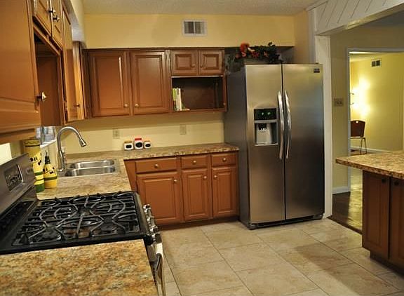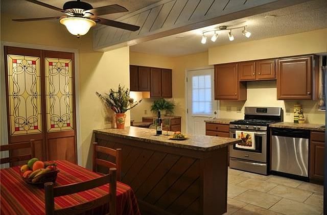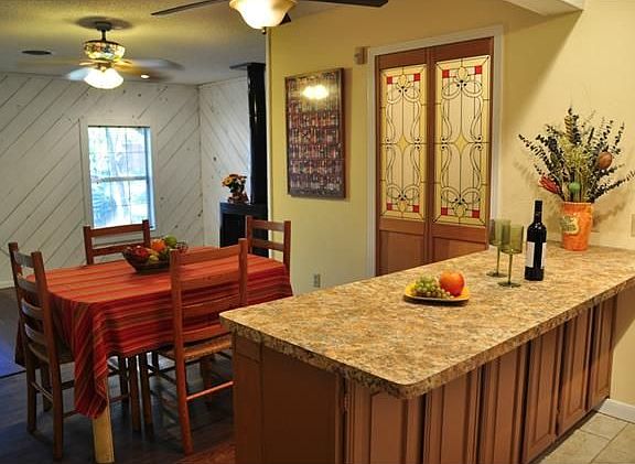 This solid house has 2 great large living areas with an open kitchen that has just been completely updated with new countertops & stainless steel appliances. WBFP in den is nice on chilly nights.3 bedrooms, 2 full updated baths, fresh paint thruout, & an enclosed patio-solarium area which has its own AC. This house needs some more exterior TLC, but the handyman will love the big workshop out back with lots of storage. Elderly owner; sold AS-IS.