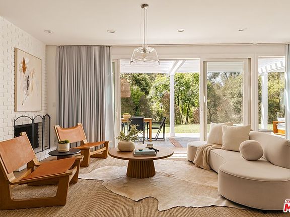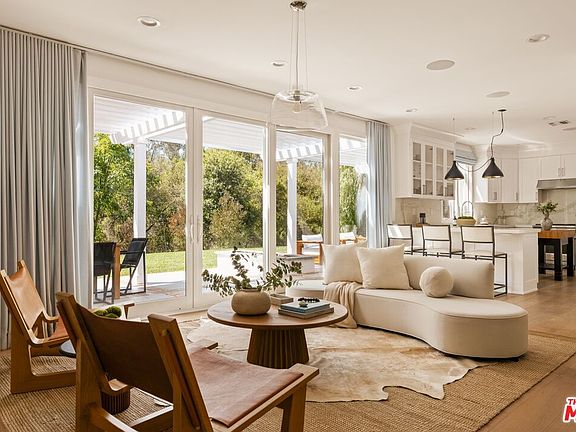Nestled on nearly 1.5 acres of lush landscaping and mature trees, this beautifully remodeled Traditional single-story home in the heart of Calabasas perfectly blends modern luxury with timeless charm. With five-bedrooms and three-bathrooms, every inch has been thoughtfully updated throughout to exude elegance and comfort in one of the most sought-after cities in Los Angeles County. The open-concept living space boasts a variety of areas - perfect for entertaining on all scales. With hardwood floors throughout, and an abundance of natural light, the expansive family and living room features a custom, built-in bookshelf and charming diamond-pane windows that frame the picturesque front terrace. A seamless flow leads you to the dining area, anchored by a brick fireplace and statement bar with backlit shelving and bespoke wallpaper. The gourmet eat-in kitchen boasts ample cabinetry, stone counter tops, butcher block island and Wolf and Sub-Zero stainless steel appliances - ideal for culinary enthusiasts. Other designer finishes include Philip Jeffries and Schumacher wallpaper, imported light fixtures, custom millwork, and natural stone surfaces and tile.Enjoy three generously sized bedrooms, including the spacious owners' retreat with sliding doors that open to a private outdoor swing-seat and views of the lush gardens. Additional highlights include a spa-like ensuite bath offering dual vanities, large walk-in shower and sumptuous soaking tub, as well as a large walk-in closet. A secondary designer-inspired dressing room is sure to impress the most discerning of buyers, and provides the ultimate sanctuary for all fashion lovers, with custom closets, shelving and a glass-top island. Additional property highlights include a home gym, sound system throughout the interior and exterior of the home, as well as smart-home features for lighting, temperature, and access. Step outside to discover a lush and incredibly private backyard oasis - a true show stopper, ideal for entertaining. From the covered terrace with outdoor kitchen and firepit, to the lush lawns with custom landscape lighting, the grounds offer the ultimate arena for relaxation. Lovingly curated with walking paths and citrus trees, the property features an abundance of privacy and seclusion akin to owning your own park. Enjoy a sparkling pool and spa with newly upgraded equipment, or stroll amongst the fruit trees along meandering paths to the chicken coop and tranquil creek below. Enjoy some of LA County's best schools and hiking/biking trails just minutes from the beach, shops, and restaurants. With its exceptional design, whimsical grounds, and prime location in Calabasas, this residence embodies the quintessential California lifestyle ideal for those seeking a stylish and luxuriously appointed retreat.