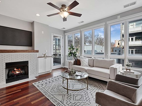 Stylish two-bedroom, two-bathroom residence situated in a rarely available Logan Square elevator building. The recently renovated home features an ideal split floor plan, hardwood floors throughout, and a spacious living and dining area with an updated gas fireplace and brand-new built-ins. The kitchen boasts stainless steel appliances, a sleek new backsplash, granite countertops, and a breakfast bar. The living space is defined by a picturesque wall of windows that allows natural light to flood the room and opens up to a freshly sanded and stained dual-access private balcony, perfect for summer BBQs and al fresco dining. The completely renovated guest bathroom includes a chic vanity, new tilework, and tasteful matte back and brass accents. The generous primary suite includes a professionally organized walk-in closet, double vanity, large soaking tub, and separate shower. A designated laundry room and foyer with a large closet add even more convenience to this home. The professionally managed building includes a common rooftop deck with skyline views, additional storage on the same floor as the condo, a garbage chute, and a bike room. The area is surrounded by acclaimed restaurants and bars, making it one of the hottest neighborhoods in the city. The price includes TWO attached heated parking spots!
