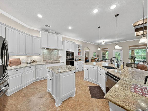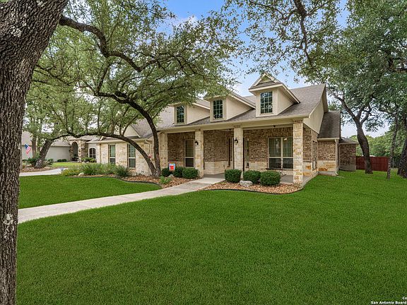 Set among mature trees in the prestigious Fair Oaks Ranch community, this 4-bedroom, 3.5-bathroom home blends timeless elegance with thoughtful design. Beautiful curb appeal and luxurious accents set the stage for the open, inviting interior. The living room makes a statement with rich wood beams, a stone accent wall, and built-in shelving, creating a warm yet sophisticated atmosphere. A spacious chef's kitchen offers stainless steel appliances, inlay oven and microwave, an inlay electric cooktop, ample cabinetry, and a peninsula with bar seating. The layout flows seamlessly into the formal dining room and a front office, providing both entertaining space and quiet work areas. The grand primary suite features an en suite bathroom with dual vanities, a separate soaking tub and shower, and an expansive walk-in closet. Additionally an dedicated media room offers the perfect space for movie nights or game days. Step outside to a generous covered patio overlooking a spacious backyard, ideal for al fresco dining, play, or simply relaxing in the shade. Located in Fair Oaks Ranch, this home offers not just comfort and style, but also a prime Hill Country setting close to shopping, dining, and top-rated schools, making it the perfect blend of luxury and everyday convenience.