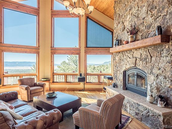 Amazing Mountain home on Yale Crest offering Stunning views of the entire valley and all the peaks - Sangre De Cristo's, Mt. Princeton, Antero & the Buffalo Peaks. Located at the end of the cul-de-sac on Yale Crest which gives nice privacy and close access to hiking in the National Forest and the Colorado Trail. The main level offers large vaulted ceilings and large windows. Beautiful foyer with full knotty alder doors and custom trim throughout. Hickory wood flooring in the family room and dining area. Large wood burning fireplace with blower and beautiful real moss rock. The kitchen has knotty alder cabins, very nice GE Monogram appliances, granite countertops, butcher block, large walk in pantry, sky light for additional natural lightening. Private dining area with granite dining room table that is included. Enjoy morning coffee on the wrap-around deck to take in the summer sun and those amazing views. The master is on the main level, beautiful 5 piece bath, cedar floor walk in closets. Beautiful wood staircase going up to the loft. The loft offers a private living space for nice reading area or great office space. Lower level has 2 bedrooms each with their own full bath. Great room has wet bar and gas rock fireplace. Pool table is great for entertaining. There is a 784' unfinished workshop and great storage area. Exterior is cedar siding, real moss rock with covered front patio and wrap around deck. Oversized 2 car garage with work bench plus a 1 car detached garage as well.