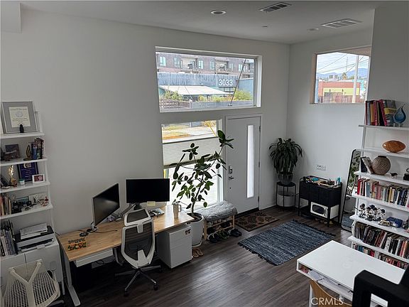 This newer build (2020), tri-level, single family, live/work space sits in the heart of the up-and-coming Frogtown neighborhood, adjacent to Silver Lake and Atwater Village. This immaculate residence is a former model home and boasts a thoughtful floor plan ideal for those seeking a true live/work space. Enter the home into a large flex area with soaring 12 foot ceilings and oversized windows. This first floor office or living space has a half bathroom and direct access to a single car garage. On the second level are two well proportioned ensuite bedrooms connected by a long hallway. The primary king-sized suite contains an oversized closet, custom blackout blinds, and access to a private balcony. A washer/dryer and linen storage also reside on this floor. The third floor is an open concept living area filled with oversized windows and natural light, creating a warm and inviting atmosphere. This living space has another half bathroom and access to a large outdoor balcony through a sliding glass door. The spacious kitchen includes quartz countertops, stainless steel appliances, walk in pantry, and water purification system. Also embrace the convenience and efficiency of smart home systems (temperature control, lighting, security, solar) and zoned HVAC. This desirable location puts you just steps from the LA River bike trail and Spoke Cafe, and walking distance from acclaimed restaurants, idyllic parks, trendy shopping, nightlife and entertainment. Don't miss this opportunity to make this residence and neighborhood your next home.