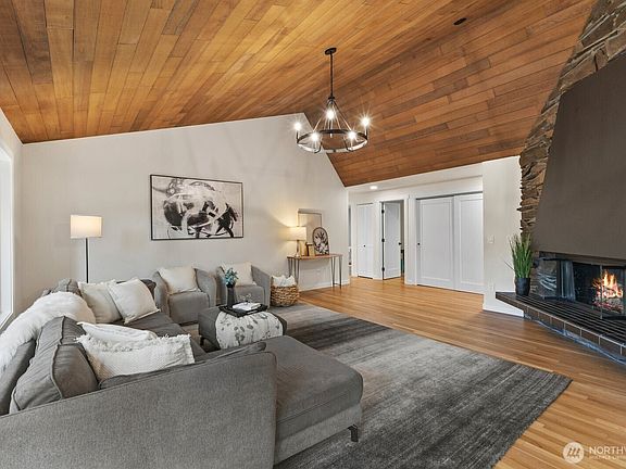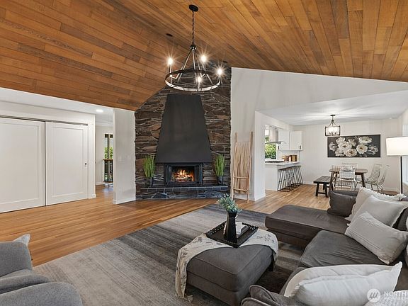 Mid Century Modern vibes shine in this beautifully updated Bridle Trails gem! Vaulted, clear cedar-lined living room ceilings & a stunning fireplace invite you to relax and rejuvenate. This move-in ready home features a gorgeous new kitchen, gleaming hardwoods, updated bathrooms, main floor primary with ensuite, 3 additional beds, bonus room, den, flex space and a wine cellar. New windows throughout frame the magical evergreen views of your own backyard tree sanctuary. Entertainment size deck with built-in gas piped fire pit make this the home your friends want to hang out at! New H2O water heater, HVAC and central A/C offer year round comfort. Draws to the award winning Cherry Crest School with easy access to 520 and all of the tech hubs!
