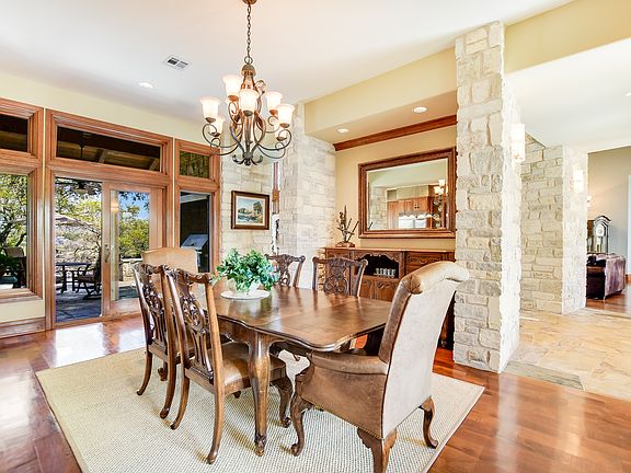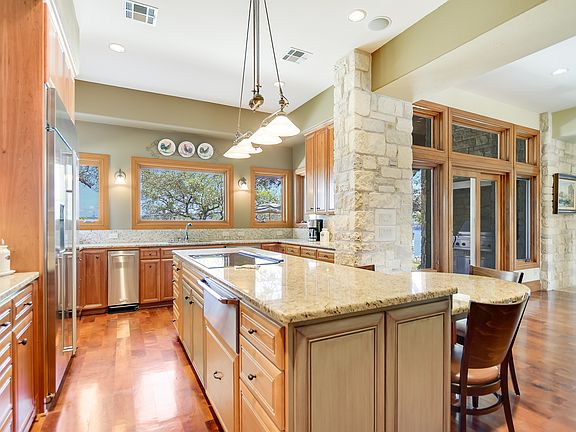 The perfect home away from home at the lake or simply every day at the lake offering views and privacy. Just a short 30-minute drive from Austin, the property sits on 2.735 acres with 400 feed of the main body of Lake Travis and then wraps around another 200 feet of deep water cove frontage. Built in a private gated golf course community, it offers water access, privacy, and lake views from all rooms. Take the paved pathway down to the boat dock, and enjoy the picnic area there or swim in the lake. Designed by Dick Clark and built to stand the test of time, this property features mesquite floors, white oak ceilings, cherry cabinetry, and granite counters. Quality workmanship is evident. There are 3 bedrooms in the main house while the guest house offers guests privacy and views, a bedroom and bath plus a living area and kitchenette. Two-slip boat dock with entertaining area makes your lake experience complete. Four car garage with loft space for storage or conversion to a bunk room. Located in the gated golf course community of lake cliff.
