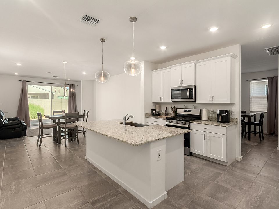 NO APPLICATION FEES!! Try Before You Buy! This practically new 3-bed, 2-bath home offers a spacious kitchen with a large island, white cabinets, granite countertops, and beautiful tile flooring with cozy carpet in the bedrooms. The well thought out split floor plan allows privacy for all occupants - with no residents having to share a common wall. Bonus feature of the home is an open den area - perfect for a home office, play area, or workout room. Washer, dryer, and refrigerator included! Located in a friendly, gated community with an amenity center featuring a pool with splash area, neighborhood parks, a sport court and coming soon - a community gym. Energy-efficient design for savings and comfort. Perfect way to test out homeownership.