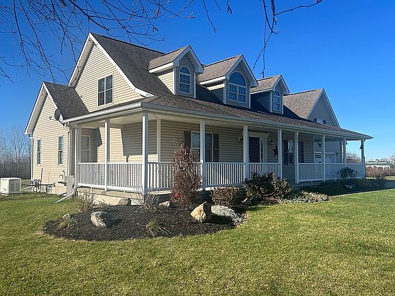 Spectacular Cape Cod home in desirable country neighborhood. Wrap around front porch with massive rear stamped concrete patio (Tri level) great for entertaining. Pristine 4-acre lot with stocked 1/3-acre pond. The front foyer leads to an office/den and beautiful great room with gas fireplace and vaulted 17-foot ceiling. Home offers an open floor plan, featuring a large kitchen with ample seating area, that looks out onto a beautiful backyard. Walk-in pantry. Garage entrance has mudroom with 1st floor laundry hook-up if desired. Half bathroom off front foyer. Master first floor bedroom has master bath with shower and jacuzzi tub. Walk-in bedroom closet. Two large upstairs bedrooms with walk-in closets. Full bathroom upstairs. 2 1/2 car attached garage. 8-foot basement ceiling with laundry facility. Super dry basement. Forced hot air furnace, central air, tankless hot water tank, central vac and Generac whole house generator for peace of mind. Please call Marty for a tour of this amazing home @ (716-984-4929). Showings start immediately. Offers due by 12 noon 11/25/24.