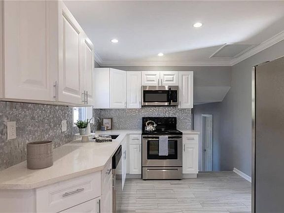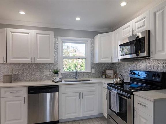 Sleek shaker-style cabinetryContemporary split-level homeAttached garageFenced-in backyardFamily roomStainless steel appliancesBreakfast eat-in area