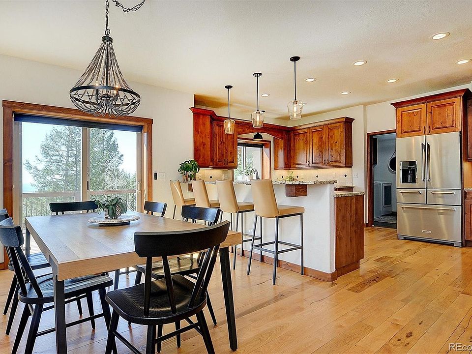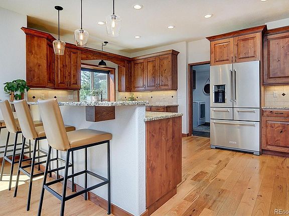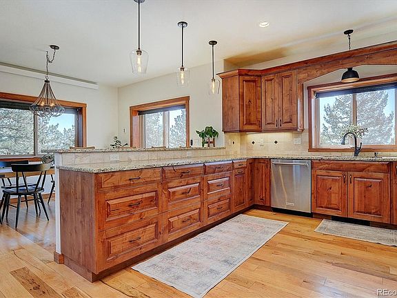 Step inside to a warm, modern rustic interior with hickory floors and alder cabinetry. A soaring 20-foot stone fireplace brings natural charm to the living room, which opens seamlessly into the kitchen and dining areas, where large windows flood the space with light. The chef’s kitchen features granite countertops, custom cabinetry, and KitchenAid appliances that make meal prep both functional and beautiful.