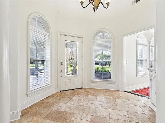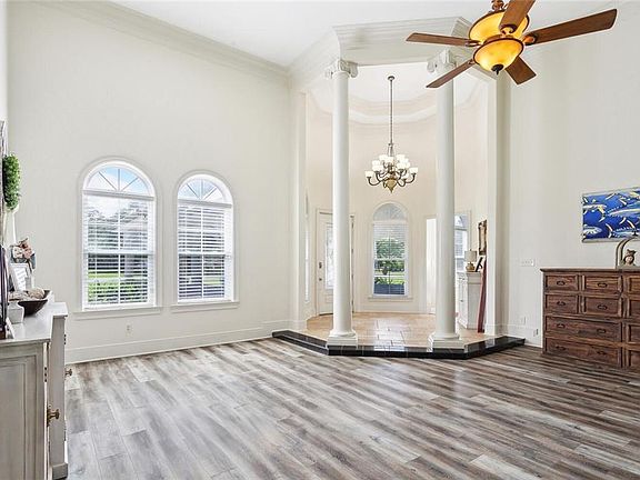 Located on 1.48 acres north of I-12, this magnificent four-bedroom and three-and-a-half bathroom residence showcases a breathtaking grand foyer, leading into the living and dining rooms, as well as a kitchen strategically positioned to overlook the entertainment areas. The foyer, dining, living room and kitchen feature 16 foot ceilings, while the bedrooms boast 10 foot ceilings. The extensive use of large windows throughout the home maximizes natural light, supplemented by a electric fireplace in the living room, expansive primary bedroom with a luxurious attached bathroom and a spacious entertainment room upstairs on the opposite side of the home. The property also features a three car garage, wooden fence, covered parking to front door entryway and a newly replace roof and gutters (only eight months old). Significantly flood zone is X, making this extraordinary home that is perfectly designed for entertaining and on private gated street ready for you to make yours!