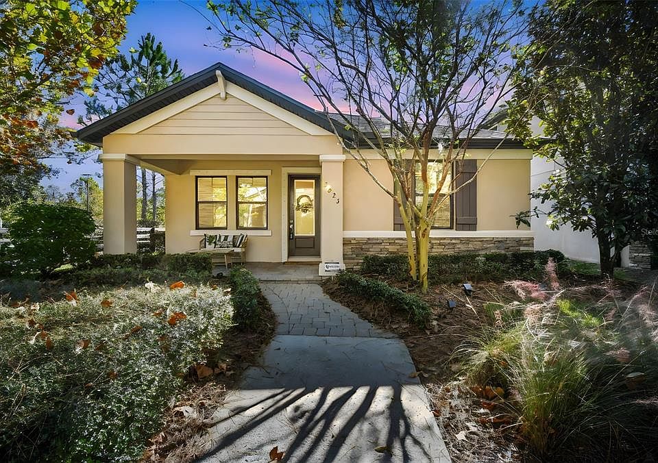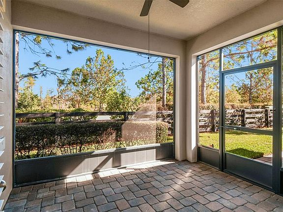 Wanting that small home town feel in Florida? Welcoming this STUNNING west facing Avalon by MI Homes with 3 bedrooms PLUS a dedicated office, 2 full bathrooms, a 2-car rear garage with over 1750 sq ft in the community of Starkey Ranch in Odessa, FL. Beautifully tucked away on a semi-private lot, this home is situated on a green space shared by only a lucky few. Single-story with a craftsman exterior style, you will LOVE enjoying the spacious covered front porch. Once inside, take note of the open, modern, yet cozy feel of the home. Neutral tile flooring throughout the main area. To your left is room #1, this could be a bedroom (no closet), an office, a playroom, a craft room, whatever fits your needs. Has modern glass paned french doors. To your right, is room #2 and #3 with lots of natural light and privacy. A full bathroom with tub/shower combo is conveniently placed for both rooms. Come into the heart of the home and find yourself an open floor plan with a stunning kitchen. Darker 42 inch cabinets with deluxe crown molding. Some cabinets do have custom pull-outs. Ample granite counter space, stainless steel appliances, and gas range. Unique stone backsplash. Center island for additional seating. The living room/kitchen concept makes it easy to converse and entertain. Large picturesque windows showcase a beautiful view of the surroundings. Tray ceiling. Across from the living area is the primary retreat. Cozy and inviting with tall ceilings and an ensuite with tiled shower and glass doors. Walk-in closet. The laundry room is off the primary retreat tucked away by the garage entry door. Built-in cabinets provided even more storage/laundry sink. The screened-in lanai is perfect for reading a book, easy conversation with drinks, and adds to the useable living space. Faces east so it will not get overly hot during the day. Keep the doors open during the cooler months and don't worry about the bugs! The 2 car garage has the epoxy flooring and water softener. Full irrigation-reclaimed water. No neighbors on one side and a gorgeous green space right off of your front porch to enjoy. A-rated Starkey Ranch K-8 school is located within the community a short distance. Across the street, is Cunningham Lake which provides a trail around it to walk, bike, or run along with a multi-purpose space for all activities. Small playground as well. Starkey offers 3 community state-of-the-art pools, one with a spray park, TONS of green space, playgrounds, dog parks, a public library, tennis courts, basketball courts, a track, and Pasco county's district park for baseball, soccer and lacrosse. Gorgeous community landscaping with not only palm trees but northern trees; you can still enjoy the leaves during the fall. Wood fence encompasses the community for that "ranch" feel.