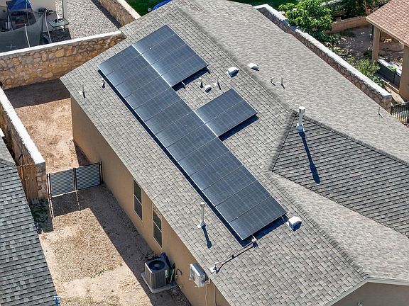 This beautifully maintained 3 bedroom, 2 bathroom home offers 1,358 sqft of comfortable living space and was built in 2019, featuring a pitched shingle roof and 19 LG solar panels for amazing energy savings. The standout is the fully tiled, fully painted garage turned man cave, complete with its own mini-split AC--perfect for summer hangouts or hobby space. The backyard is ideal for entertaining with raised rock walls, a 15x20 added concrete slab, and a covered patio ready for gatherings. Inside, the split floor plan places the primary suite at the back for comfort, while the two guest bedrooms sit at the front. An open-concept living room, kitchen, and dining area make the home feel bright, spacious, and inviting. This price is unheard of in today's market--don't wait, call now before it's too late!