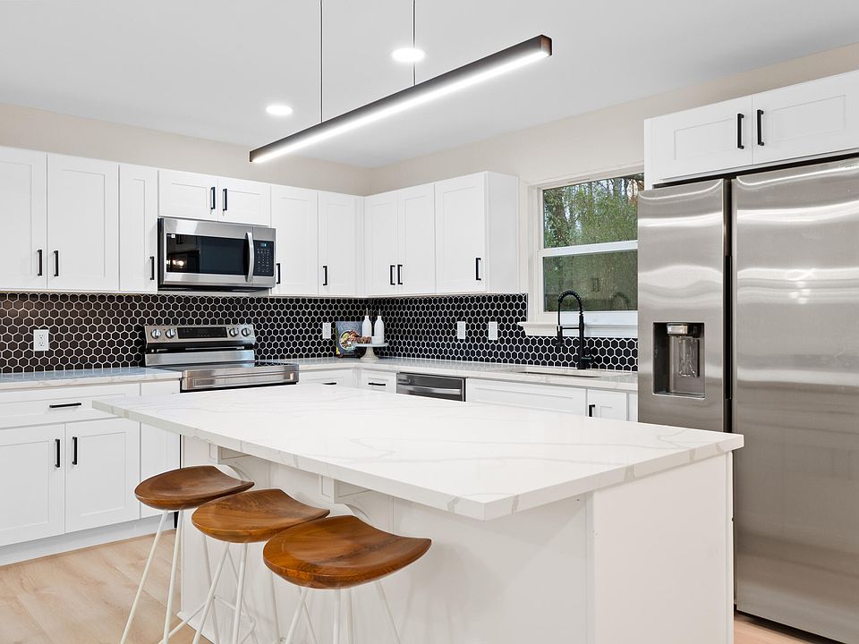 The kitchen serves as the heart of the home with a large island, new appliances including refrigerator, microwave, dishwasher, and range. The new soft- close cabinetry, sleek quartz countertops, designer tile backsplash, and modern lighting create the perfect entertainment space in this open layout.