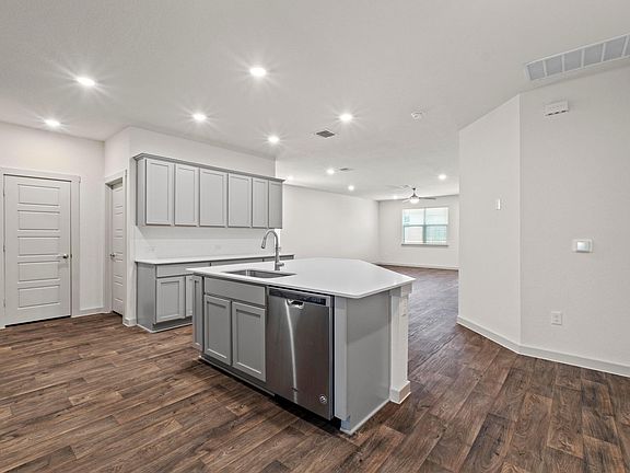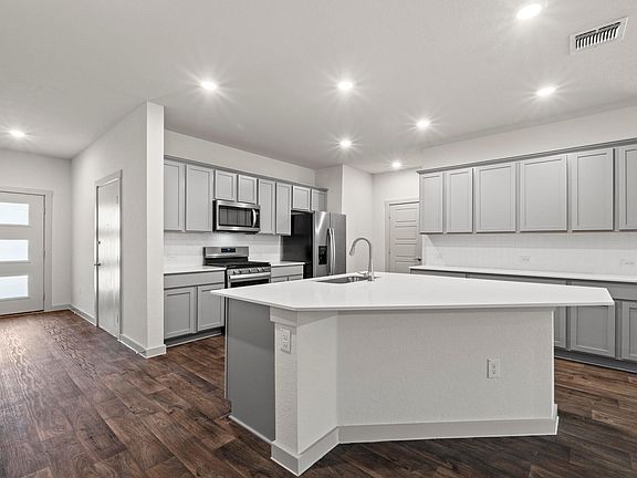 Bright natural lightStainless steel appliancesModern open floor planAbundance of storageHuge islandSleek quartz countertopsGourmet kitchen