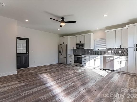 Step inside to a bright, open-concept layout highlighted by luxury vinyl plank flooring, recessed lighting, and abundant natural light pouring through oversized windows. The spacious living area flows seamlessly into the showpiece kitchen—complete with quartz countertops throughout the entire home, all-white soft-close cabinetry, stainless steel appliances, and a striking herringbone tile backsplash.