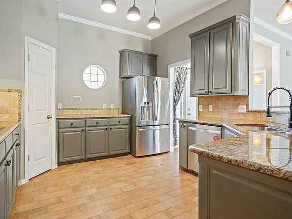 Majestic treesHome officeFloor to ceiling windowsLarge covered porchWood-like flooringStainless appliancesGranite countertops