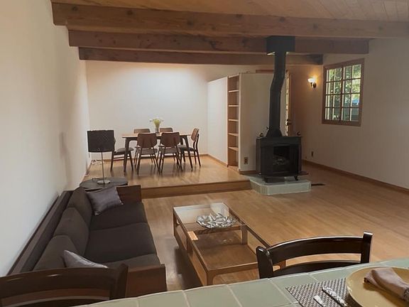 Inside, warm natural light fills the open living area, creating a tranquil ambiance ideal for relaxation or creative inspiration. The kitchen is equipped with essential modern appliances and opens to a cozy dining space perfect for morning coffee or intimate dinners.