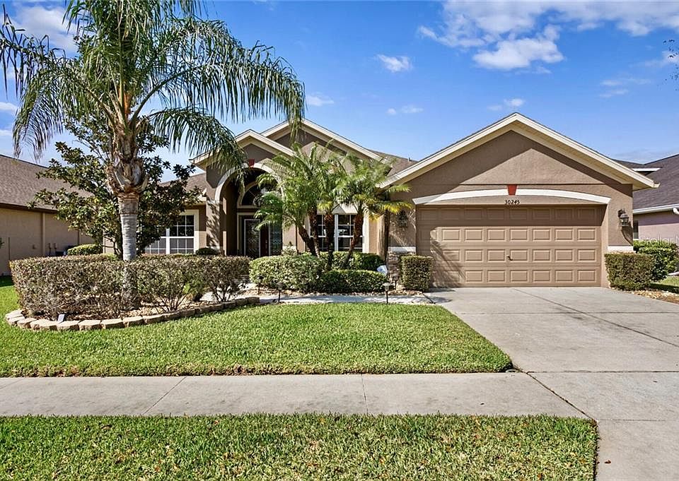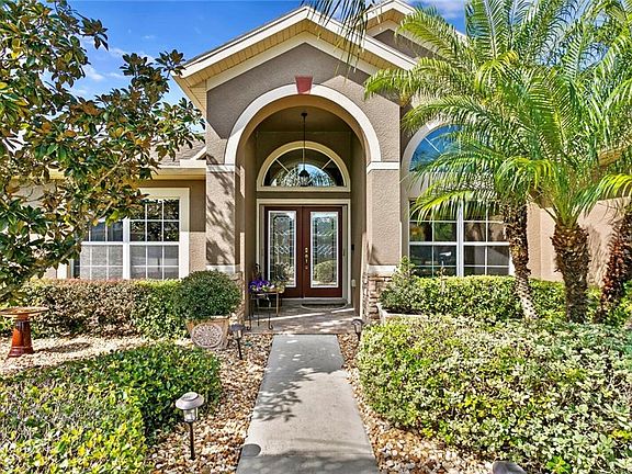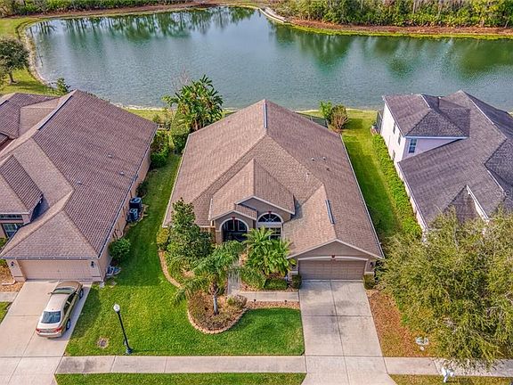 An unparalleled contemporary waterfront retreat with attention to every detail. Perfectly positioned on an amazing waterfront home site ($30k Lot Premium). Designer perfect with no expense spared in upgraded finishes makes this signature property a rare find indeed. An inviting curb appeal welcomes you with pristine landscaping, perfectly manicured gardens and elegant beveled glass front doors. A grand foyer with soaring ceilings, architectural cut-outs, art niches and archways greet you and open to the great room area. This thoughtful floor plan offers 3 bedrooms, office, formal dining room, great room, 2 car garage and massive custom pavered lanai. The office is conveniently located off of the foyer and offers custom French doors with vaulted ceiling. Bring the outside in! The great room is the focal point of the home and boasts walls of glass overlooking deep water views with dramatic 8 foot pocket sliding glass doors and oversized transom windows. A gourmet kitchen overlooks the great room, lanai and waterfront views. Boasting top of the line 42" raised panel Maple cabinets, thick Ogee edged granite countertops, custom under-mount sink, high top breakfast bar, island workstation with extra storage, pendant lighting and stainless steel appliances. This 3-way split floor plan offers a private master bedroom retreat with sleek plank wood flooring, upgraded ceiling fan and oversized windows overlooking dramatic water views. The upgraded master bath boasts Listello tile accents in wet area adding a unique design, Ogee granite countertops, maple cabinets, upgraded his/her sinks, walk-in shower with travertine saddle tile, separate garden tub and a large walk-in closet with a Cherry Wood built-in closet system. The secondary bedrooms are located in the rear of the home and are ample in size. The dedicated laundry room leads into the 2 car garage with ample amount of storage and attic access. The custom lanai is expansive in size and offers an exquisite pavered deck with room for endless entertaining possibilities. This community has all that you need including 2 large pools, lighted tennis courts, Pickleball court, covered large playground, dog park, basketball court and remodeled workout center. With low HOA fees you can have it all! Minutes to I -75, Wiregrass Mall, Tampa Premium Outlets, Restaurants, Shopping, and more! Welcome Home!