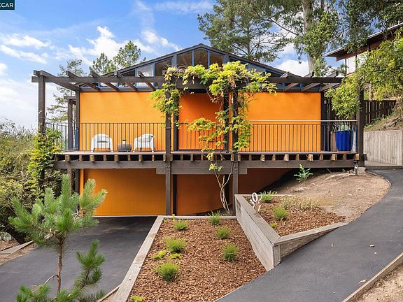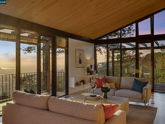 Mid-Century Wow! First time on the market since being built in the early 1960s, this Architectural Gem has been meticulously restored. Nestled in the trees on a double lot above the Temple of the Wings. Amazing San Francisco Bay views of sunsets over Mount Tamalpais in the summer and the Golden Gate Bridge in the winter. Initially designed in 1961 by Berkeley architect Myra Brocchini for her parents, it has been the architect’s home most recently. A stunning example of Bay Regional architectural style, the approximately 2,610 square foot house features an open floor plan, high ceilings, expanses of vertical glass, and clerestory windows to maximize views and bring in natural light - the architecture is at once simple and complex. The main floor is upstairs, designed to embrace the views from almost every angle, with a wide entry gallery, living and kitchen spaces, two bedrooms and two baths, and a fabulous laundry room. Take the elevator or stairs to the downstairs family room/office space. Bring your design ideas and transform the lower level into a primary suite or ADU. The home boasts an easy-access two-car garage and loads of storage space. Don’t miss this extraordinary home!