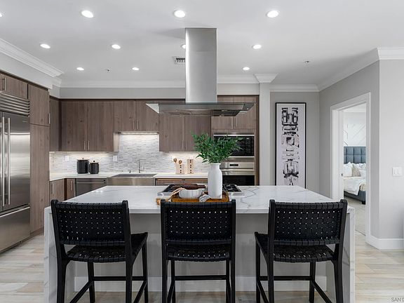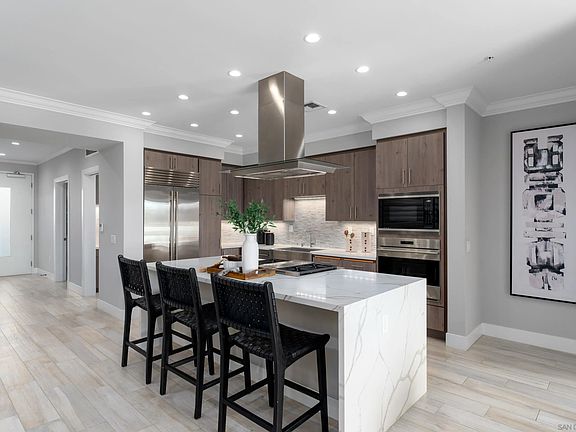 Welcome to this beautifully upgraded single-level condo just minutes from Shelter Island and the scenic Bessemer Path along the bay—perfect for walking, jogging, or taking in stunning views. Located in the heart of Point Loma Village, this home offers the best of coastal living with restaurants, shops, and the waterfront all within easy reach. Inside, you’ll find designer finishes throughout, including quartz countertops, a waterfall island, and premium Sub-Zero and Wolf appliances. The open floor plan connects the kitchen, dining, and living areas, along with a flexible room that can serve as an office, den, or be converted into a third bedroom. This home features two spacious bedrooms, each with its own en-suite bathroom for ultimate privacy and convenience, as well as a half bath perfectly situated for guests. The spacious primary suite boasts dual custom closets and a spa-style bath with soaking tub, separate shower, and double vanity. Additional highlights include a fireplace, crown molding, plantation shutters, and motorized blinds. Enjoy morning sun and evening breezes from the oversized east-facing patio with views of the Village. The home also includes a private storage closet, two side-by-side parking spots in a secured garage, and HOA-covered Wi-Fi. With direct access to a landscaped community lounge and BBQ area, and located in a quiet 16-unit complex, this condo offers relaxed luxury in an unbeatable location.