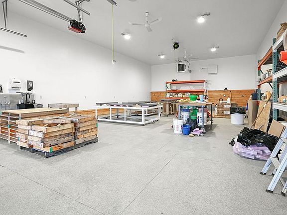 Gas fireplaceMultiple overhead doorsHalf bathEpoxy-finished shop and showroomOutdoor parkingCustom-built storage baysMetal roof