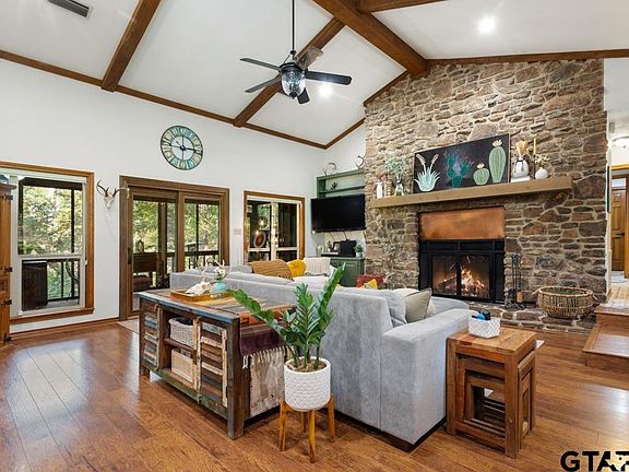 Welcome home to Country Place, one of Tyler's most desirable subdivisions in award-winning Whitehouse School District! Tucked away at the back of 2.5 acres of lush lawn and perennial plants, this rustic home with stone detailing offers the perfect blend of rustic charm, modern updates, and tranquility. As you meander down the path to the front door, you are greeted by camelia bushes, cannas, azaleas, ferns and a cozy front porch. Once inside, the living area is sure to impress with vaulted ceilings with wood beams and a massive floor-to-ceiling stone fireplace with striking copper accent that transfers heat to the large living area. The newly remodeled kitchen is open to the great room and features stainless steel Kitchenaid appliances, Monaco quartzite countertops, brand new custom built cabinetry painted SW dried thyme and a 10 ft contrasting island finished in refined alder. Also completely renovated this year, is the primary bath boasting separate stained alder vanities with dolomite countertops, a luxurious soaking tub and a walk-in shower with dual shower heads. Teal subway tile, a corner chandelier, and a picturesque view from the tub creates a spa like experience. The primary bedroom features a wood burning fireplace, landscape views and access to the screened back porch where you can enjoy brisk autumn evenings. Follow the stone path to a storage building and then a quaint guest cottage with its own small porch, space for a bed and small living area, a kitchenette and refrigerator along with a small bathroom for guests. The Country Place subdivision has a vibrant social life with a bunco club, a book club, a fall festival, which includes a hayride through the neighborhood to neighbors handing out treats for the kids, an Easter egg hunt in the spring, and fishing tournaments yearly in the 3 main ponds. Deer wander around in the wooded foliage of this treed neighborhood adding more charm to the serene lifestyle this neighborhood offers.