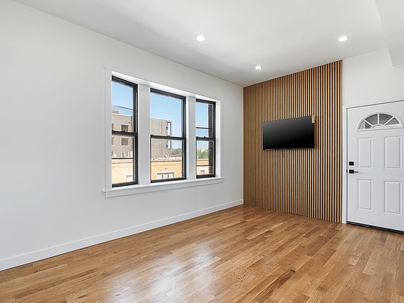 This impeccable two-bedroom, one-bath residence exudes modern sophistication and high-end finishes throughout. Featuring rich hardwood floors, sleek flat-panel cabinetry, premium stainless steel appliances, and a striking slatted feature wall complete with mount for flat-screen TV. The bathroom showcases a frameless glass standing shower and luxurious stone tile flooring. Enjoy the convenience of in-unit washer and dryer, while expansive windows bathe the interior in natural light. The unit also offers a private outdoor patio, perfect for relaxation or entertaining.