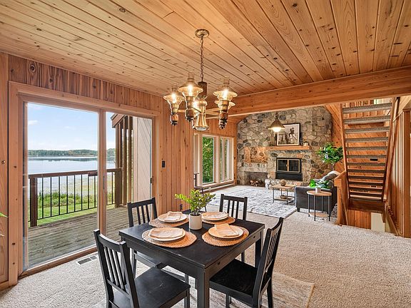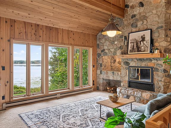Inside, you'll immediately notice the artistry that sets this home apart. Knotty pine walls, tongue-and-groove ceilings, and open railings create a grand and welcoming atmosphere. Mid-century modern windows frame panoramic views of School Lake’s natural beauty. The two-story stone hearth surrounding the wood-burning fireplace is truly a showpiece, and integrated lighting in the exposed beams highlights just how ahead of its time this design really is. The flexible layout is perfect for age-in-place living or accommodating multi-generational families, ensuring comfort and accessibility for every stage of life. The main level features a spacious primary bedroom with its own private deck, walk-in closet, and a private 3/4 bath. Upstairs, two generously sized bedrooms with vaulted ceilings are separated by a cozy loft with built-in bookshelves, offering lake views and a perfect spot to relax or read. The walk-out lower level adds even more versatility, with an additional bedroom, a family room with a wood burning stove, and a library or office space—ideal for book lovers, musicians, or as a fun game area. Outside, at the heart of the farm, stands a 2,353 sq ft barn, designed with every need in mind. Five spacious horse stalls, a dedicated horse shower, tack and feed rooms, and a walk-up attic for storage make daily chores efficient and enjoyable. The oversized three-car garage accommodates vehicles and trailers, while the 40 x 23 open shelter behind the barn keeps livestock content and protected, no matter the season. This property is a haven for both horse and cattle enthusiasts. The varied landscape helps with pasture rotation, protecting the land’s health and keeping your animals happy with plenty of grazing options. Blaze your own trails for riding or skiing, set out boating on the lake, or create the garden of your dreams—all without leaving your land.