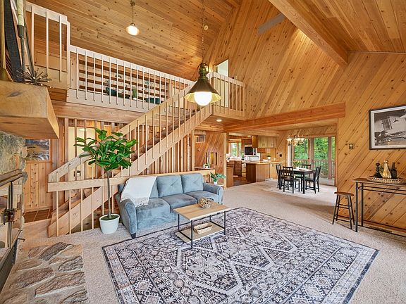 Horse stallsWood-burning fireplacePanoramic viewsCozy loftOversized three-car garageNatural shorelineVaulted ceilings
