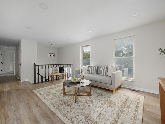 The main level features an open living and dining area with large windows and a seamless connection to the kitchen. The kitchen includes a center island, stainless steel appliances, and a clean, modern design complete with white shaker cabinets that make cooking and gathering enjoyable. Down the hall are three inviting bedrooms, including a primary suite with its own bath and a second full bathroom nearby.