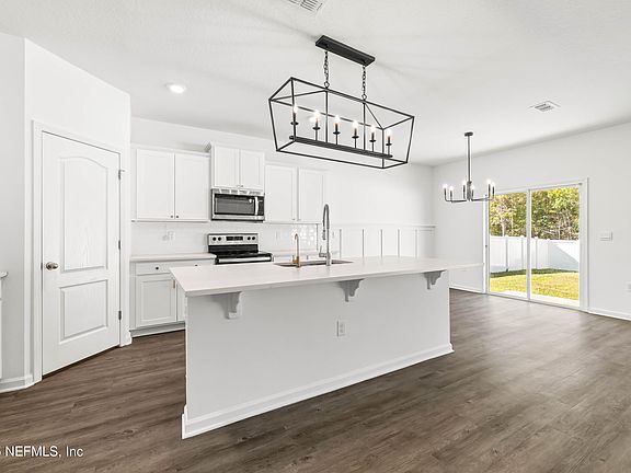 This PRACTICALLY NEW HOME in CROSS CREEK is stunning! Located on a PRESERVE LOT & built in 2023, this 5-bedroom, 3-full bath home w/ a 2-CAR GARAGE shows like new. The open living area features VINYL WOOD-LOOK FLOORS w/ lots of natural light. The kitchen has WHITE QUARTZ COUNTERTOPS, white cabinetry w/ crown molding, stainless appliances, brushed gold hardware, & a good size pantry. Also located downstairs is a bedroom & full bath. The oversize primary suite upstairs features BEAUTIFUL PRESERVE VIEWS, & the primary bath has a LARGE TUB/SHOWER COMBO as well as a WALK-IN CLOSET big enough for any wardrobe. 3 other bedrooms are also upstairs. Enjoy cool nights around the BACKYARD FIRE PIT in the fully-fenced yard. SOLAR PANELS included (paid off by Seller at closing!); Washer/Dryer & Water Softener also convey. Cross Creek's amenities include a resort-style pool, fitness, pickleball, volleyball, playground, & RV/BOAT STORAGE. Top-rated Clay County schools nearby. Don't miss this home!