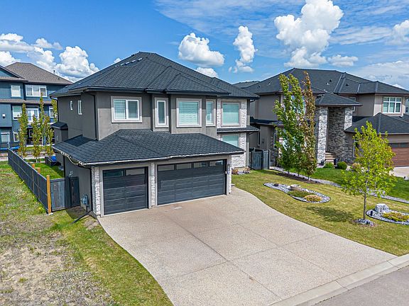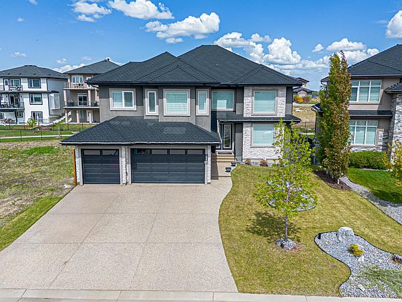 Welcome to this stunning 3,870 sq.ft. custom-built home w/ a triple car garage, perfectly situated in a quiet cul-de-sac backing onto the walking path. Designed for modern living, this home offers 5 bedrooms, 4 full bathrooms, & a thoughtfully designed open-concept layout. *MAIN FLOOR BEDROOM w/ full bath + 2 PRIMARY SUITES w/ 5 PC ENSUITES – Perfect for multi-generational living! Discover soaring open-to-below ceilings, elegant hardwood floors, & a gas fireplace, creating a warm & welcoming space. The chef-inspired kitchen is a showstopper, featuring upgraded appliances, a gas stove, & an expansive island—perfect for entertaining! Upstairs, a bonus room open to below offers the perfect retreat. You'll find two luxurious primary suites, each w/ a walk-in closet & spa-like 5 pc ensuite, plus a private balcony overlooking the backyard & walking path. Two more secondary bedrooms & laundry complete the upper level. Step into the yard onto the 2-tier deck w/ natural gas hookup—ideal for family gatherings!