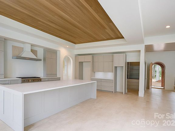 The gourmet kitchen is a showstopper with white oak tray ceiling detail, a spacious island, and custom cabinetry. A walk-through scullery features an additional oven, sink, dishwasher, and abundant storage—plus a hidden pantry door and access through the drop zone for seamless organization.