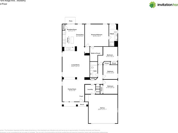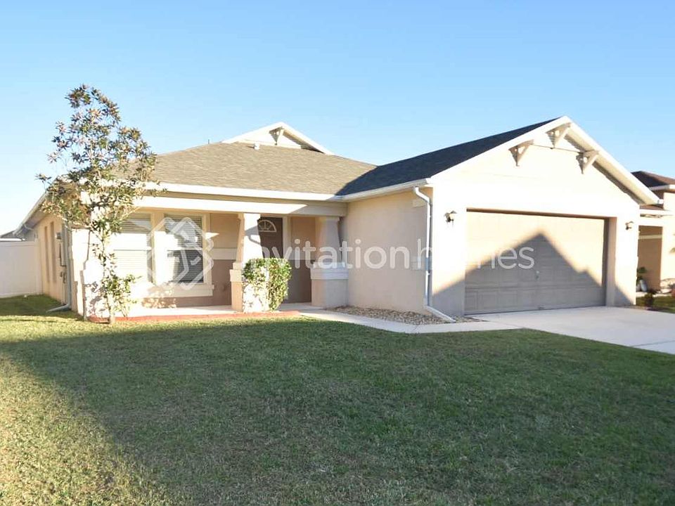 Home Features and Amenities: Air Conditioning, Breakfast Nook, Covered Porch, Fenced Yard, Garage, Granite Countertops, Kitchen Island, Long Lease Terms, Open Floorplan, Pet Friendly, Primary Bedroom on Main, Recessed Lighting, Single Story House, Smart Home, Stainless Steel Appliances, Tile, Walk in Closet, W/D Hookups, and professionally managed by Invitation Homes.