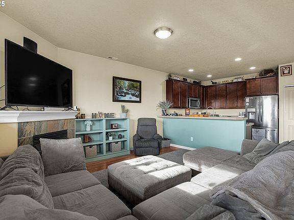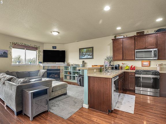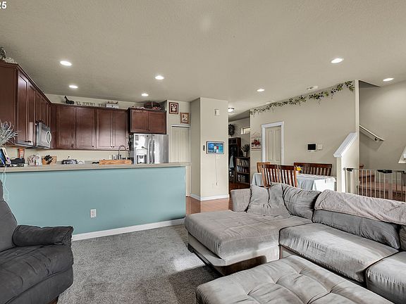 Welcome to small town living in North Plains with quiet streets and wide open country views. This 3 bed, 2.5 bath home has 2230 sq ft of living space, including a full third floor bonus area. The main level has an open living and kitchen layout with a gas fireplace, eating bar, and a nook style dining space. The kitchen has stainless steel appliances, including a new gas range, new dishwasher, and new overhead microwave. The second floor includes two bedrooms plus a primary suite with French doors, a walk in closet, double sinks, and a walk in shower. The entire third floor is a large family or bonus room, giving lots of options for play, office, media, shared space, or storage. Upper floors look out over nearby farmland, and the fenced backyard has a covered patio for year round outdoor use. The roof was replaced in 2024. All appliances stay, including the washer and dryer. Oversized 1 car garage provides extra storage space. This location is a short drive to Hillsboro, tech hubs, shopping, schools, and parks, while still feeling quiet and country. Bring your ideas and make this home work for you.