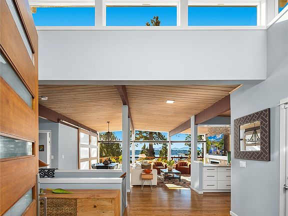 Stunning mid-century modern Mercer Island retreat 3 bed/2.5 bath w/ sweeping westerly views of Lake Washington, Seattle skyline, and Olympic Mountains. Walls of glass frame the open main floor, blending indoor/outdoor living with access to an expansive entertaining deck. The updated kitchen is a delight w/ custom banquette and plenty of counterspace. The main level offers huge great room, formal powder room, primary suite w/spa bathroom and walk-in shower. Downstairs, find two additional view bedrooms, bathroom, rec room, utility room and tons of storage. Beautifully landscaped and low maintenance gardens create a year-round tranquil environment. This home is a rare blend of architecture, style, modern conveniences and amazing sunset views!