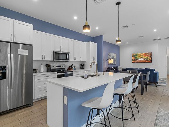 Inside, the open-concept layout is filled with natural light and tastefully furnished to make you feel at home from day one. The living room features a 60" Smart TV and comfortable seating, while the fully equipped kitchen makes meal prep easy with stainless steel appliances, cookware, dishes, and a coffee setup. Each bedroom includes a Smart TV and dedicated workstation, giving you both privacy and productivity. The master suite is a highlight, offering a king bed, walk-in closet, en-suite bath, and direct pool access. A queen bedroom and a bunk room with queen-over-queen beds provide flexible sleeping options for families or professionals sharing space.