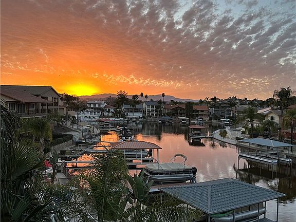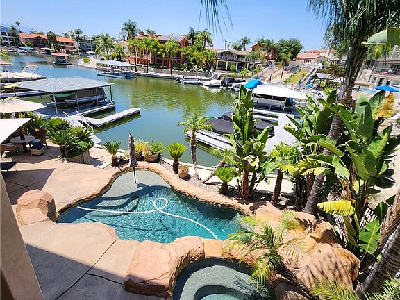 Get ready to be swept away by this breathtaking Waterfront and Resort Style Tropical Pool, Mediterranean Modern masterpiece in the exclusive gated golf and lake community of Canyon Lake! This 2-story, 3 level, 3,689 sq.ft. luxury haven is a dream come true. Step through grand double doors into a serene foyer with travertine flooring, where elegance greets you at every turn. This home is packed with wow-factor: 3 bedrooms, 3 bathrooms, an office/library with double glass French doors, custom cabinets with a rolling library ladder, a cozy sitting/loft area, and a massive bonus room that could easily be a 4th bedroom. Soaring cathedral-vaulted ceilings, a striking custom rod-iron staircase, and vibrant stained glass windows steal the show. Crown molding, plantation shutters, central vacuum, whole house water filtration system and two fireplaces elevate the vibe, while the gourmet kitchen is a chef’s paradise—granite countertops, stainless steel appliances, massive double refrigerator, oven, 6-burner with grill stove, pot filler, dishwasher, and a large island with a copper sink. Custom cabinetry ties it all together. The master suite is pure indulgence: a large deck with mesmerizing water views, a dual shower, jacuzzi tub, and a sprawling custom closet. Outside, dive into the pebble tec pool and spa with a waterfalls a hidden bench seat under the falls and beach entry, or kick back on the expansive patio in a tropical oasis with a sandy beach area. Lush, professionally landscaped grounds burst with palm trees, bird of paradise, and vibrant flowering plants. Your private boat dock with ramp makes lake life a breeze. A 3-car split garage with epoxy flooring includes a bonus gym or storage space. Two sprawling balconies invite you to soak in stunning water and sunset views. Canyon Lake’s amenities are endless: water skiing, wakeboarding, kayaking, paddleboarding, cruising, fishing, golf, pickleball, tennis, basketball, baseball, an equestrian center, biking, a bike park, dog park, golf carting, multiple community parks, a senior center, restaurant, lodge, and recreation hall, year round community events. Plus, you’re minutes from shopping, schools, and freeways. This isn’t just a home—it’s a lifestyle! Seize this rare opportunity for luxury and adventure in Canyon Lake.