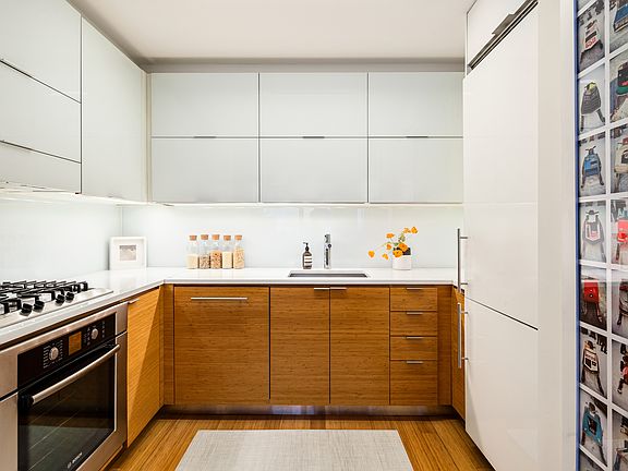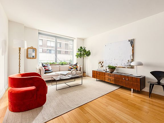 Modern elegance meets everyday ease in this light-filled, impeccably designed two-bedroom, two-bathroom residence at one of Kips Bay's most coveted full-service condominiums. Spanning 1,140 square feet, this thoughtfully laid-out home welcomes you with rich bamboo floors, soaring ceilings, and expansive art walls that elevate the entry experience. The foyer sets a refined tone with custom wall coverings and a generous closet, opening into a spacious living and dining area framed by oversized north-facing windows. Perfectly suited for entertaining or quiet evenings in, the space flows seamlessly into a sleek chef's kitchen outfitted with wood and lacquer cabinetry and premium Sub-Zero and Bosch appliances. The serene primary suite features a large closet and a spa-caliber marble bathroom complete with a deep soaking tub, a frameless glass rain shower, and striking tile work. A well-proportioned second bedroom sits just across from the guest bathroom, ideal for visitors or a stylish home office. An in-unit washer/dryer and central air ensure effortless comfort throughout. Built in 2009, 303 East 33rd Street is a Gold LEED-certified condominium offering an impressive suite of amenities. Enjoy 24-hour doorman service, on-site maintenance, a fully equipped fitness center with a yoga room, a stunning resident's lounge with a garden-level atrium and fireplace, a screening room, playroom, storage, and direct-access garage parking. The showstopping 5,000-square-foot rooftop garden features a putting green, bocce court, grilling stations, sundeck, and a reflecting pool, creating an elevated oasis in the heart of the city. Perfectly positioned in lively Kips Bay, you're moments from Fairway, Trader Joe's, the AMC theater, and countless neighborhood favorites. Easy access to the 4/5/6, L, and S trains, 34th Street Ferry, and CitiBike make getting around a breeze.