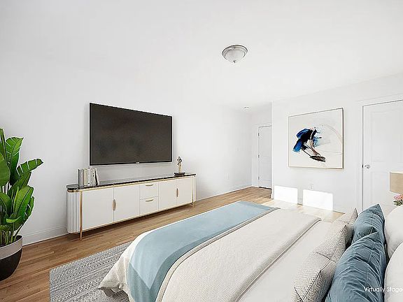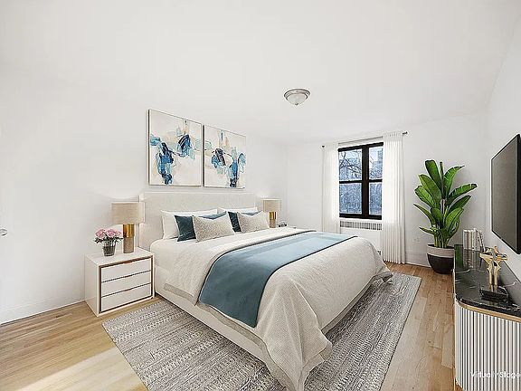 Upon entering you find yourself in a full size dining room that is adjacent to both the windowed galley kitchen and the Art Deco step down into your 12 x 20 sunken living room. There are hardwood floors and high ceilings throughout. The master bedroom can easily fit a king size bed and other furnishings with room to spare. The second bedroom works perfectly as either a second bedroom or a home office. The windowed bath is in the hallway outside of these bedrooms.