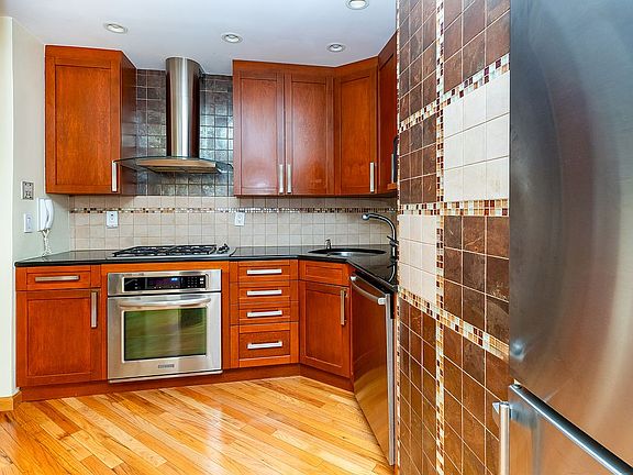 An elegant foyer welcomes you into an expansive, inviting living area defined by 9-foot ceilings and beautiful wide-plank wood flooring. This home is designed for gracious entertaining, featuring an open dining space featuring views of the Chryster building & East River, a custom built-in bookcase, and is meticulously arranged to emphasize the impressive scale and elegant flow of the room. The well-appointed, functional kitchen features sleek stainless steel appliances, rich custom cherry cabinetry, and deep black granite countertops.