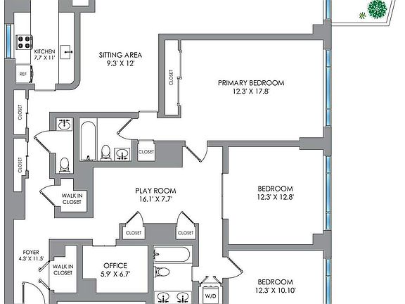 The windowed kitchen is outfitted with granite countertops and backsplash, a beautiful granite floor, and stainless-steel appliances including a refrigerator, oven, dishwasher, microwave as well as expansive cabinet space. Bordering the kitchen is a beautiful windowed breakfast area. The spacious primary bedroom easily accommodates a king size bed and has an oversized window, a deep walk-in closet, and an En-suite bathroom with marble accent. The second and third bedrooms also has oversized windows with amazing city views. A second full bathroom complete the offering with crisp white tile, marble-topped double vanity and a soaking tub. This wonderful layout also features a brilliant private home office and a library area off the bedrooms to wind down and relax. The apartment is pre-wired with Verizon Fios .