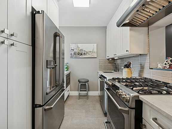 Prepare gourmet meals in the high-end chef's kitchen that overlooks the Chrysler building, equipped with custom cabinetry, countertops and backsplash, a pantry with slide-out shelves, and suite of stainless steel appliances including a stove with vented hood, double-door refrigerator with a built-in cafe /ice machine, dishwasher and microwave. Adjoining is a convenient bar/serving area with counter seating, a wine fridge, and custom display shelves.