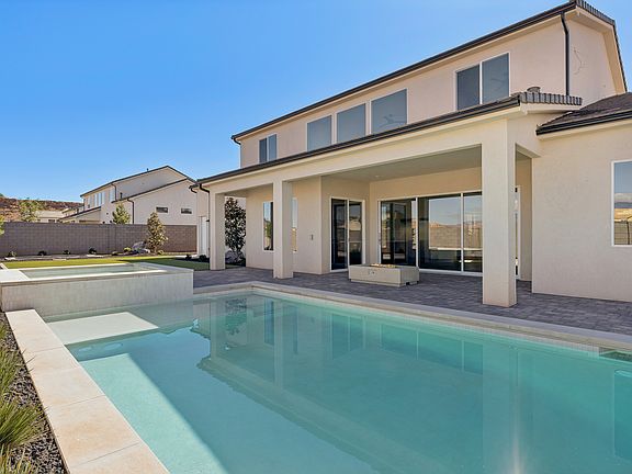 This stunning home with Pine Valley Mountain views features a pool, hot tub, firepit, trampoline, and boat garage, all on a fully landscaped, fenced lot with no neighbors directly behind. Just blocks from Crimson Cliffs High & Middle School. Inside, discover engineered wood floors, custom cabinetry, and a gourmet kitchen with drop-in cooktop, vented range hood, floor-to-ceiling cabinets, and quartz countertops. Additional features include a mudroom with locker cabinets, gas fireplace with built-in wall unit, spacious laundry with sink and storage, and walk-in pantry. The primary suite offers a freestanding tub, makeup vanity, tiled walk-in shower, and oversized closet with built-in drawers. An additional bedroom with ensuite on the main level provides perfect accommodations for guests. All information deemed reliable but not guaranteed; buyer to verify all.