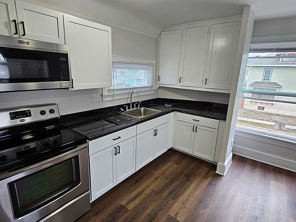 Modern kitchen with appliances included: stove, microwave, refrigerator